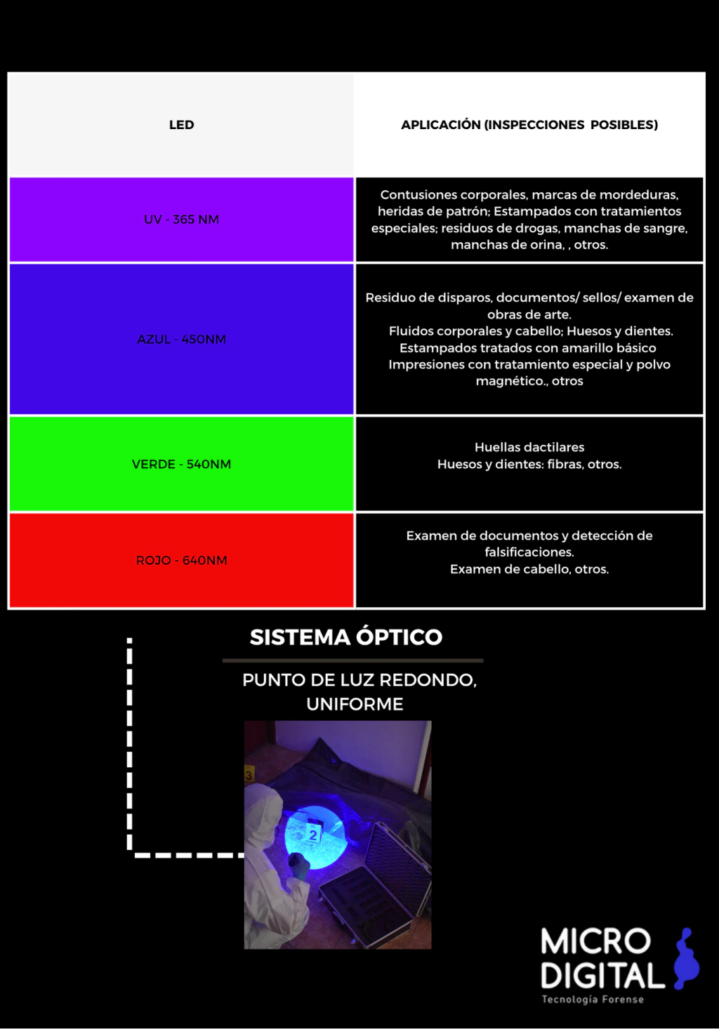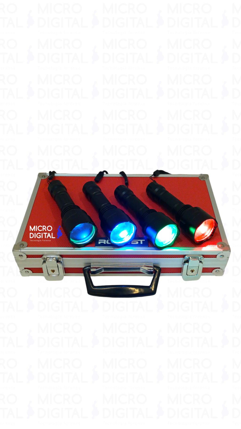 Kit de luces Forenses, tambien conocidas como fuentes de luz alternativa, se utilizan para encontrar una gran cantidad de indicios en la escena de los hechos, como lo pueden ser huellas latentes y huellas de pisada, pelos y fibras, huellas de mordedura y algunas lesiones, fluidos biológicos, residuos de arma de fuego, tintas en documentos, y fragmentos óseos y dentales.